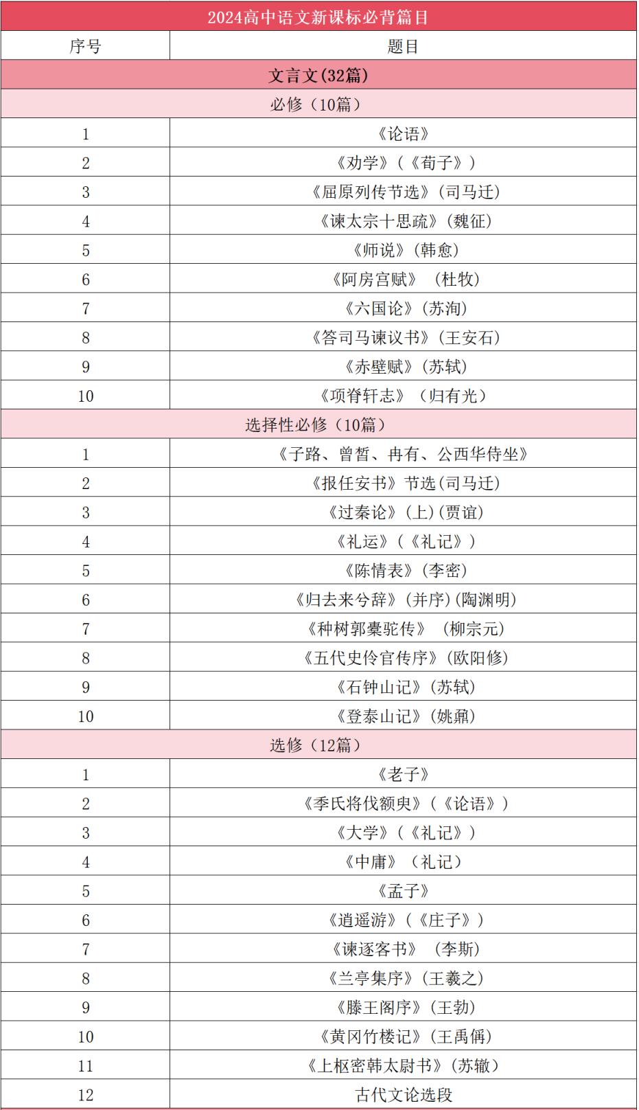 高考中的每一分都是非常重要的,甚至还可能影响考生的命运,所以对于名篇名句默写这几分,考生最好都能拿到手。若想要轻松拿下默写题,就一定要仔细背诵语文课本中的文言文和诗词曲。以下是2024高中语文新课标必背篇目清单。