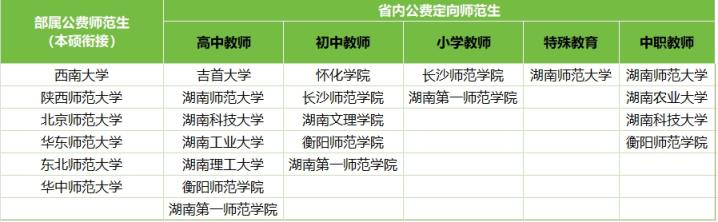 在湖南省公费师范生计划主要分为国家公费师范生计划和省内定向公费师范生计划,国家公费师范生计划主要由部属公费师范生院校进行承担,省内定向师范生计划主要分为小学教师、初中教师、高中教师、特殊教育教师、中职教师培养计划,承担培养计划的院校名单如下: