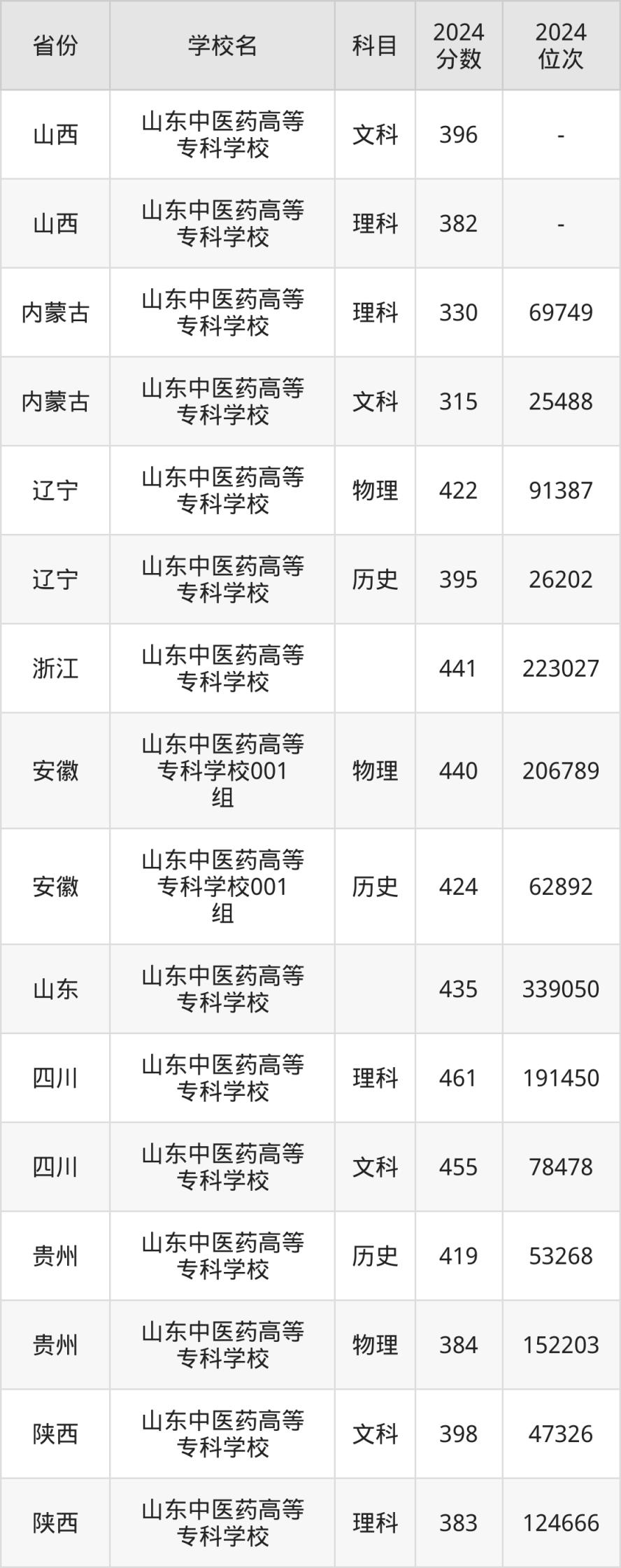 下面是山东中医药高等专科学校2024年录取分数线一览表: