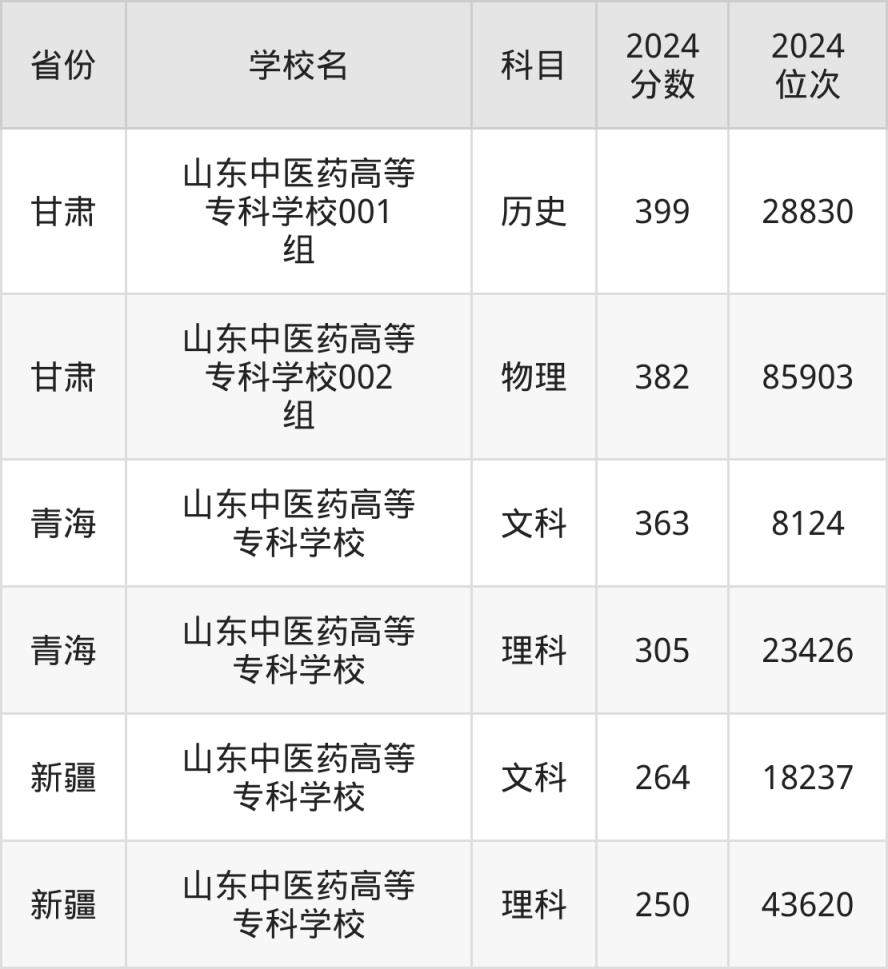 由于全国数据较多,因此本文仅展示山东中医药高等专科学校省内近三年录取分数线汇总。