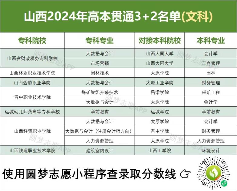 2024年在文科招生的高本贯通学校共有7所,包括山西省财政税务专科学校、山西林业职业技术学院、山西金融职业学院、运城幼儿师范高等专科学校、山西经贸职业学院、山西铁道职业技术学院。招生专业包括大数据与会计专业、人力资源管理、市场营销专业、学前教育专业等。