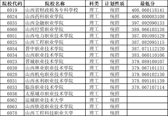 2024年山西省高本贯通学校在理科的录取分数线在378-408分之间,目前山西水利职业技术学院和临汾职业技术学院的录取分数线最低,山西省财政税务专科学校的录取分数线最高。