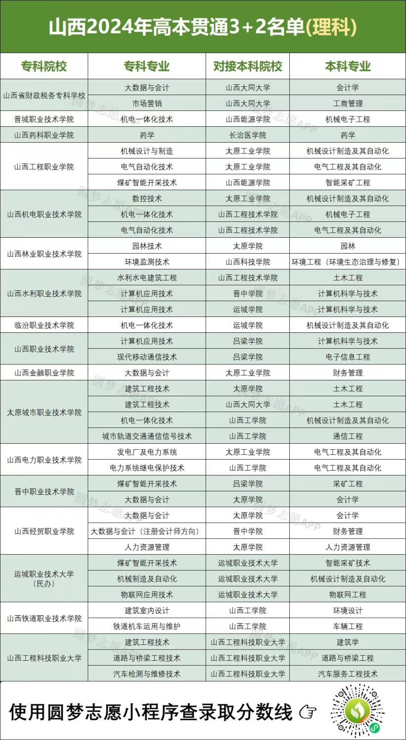 2024年在山西省理科招生的高本贯通学校共17所,包括山西省财政税务专科学校、山西药科职业学院、运城职业技术大学、山西电力职业技术学院、山西经贸职业学院、山西金融职业学院、山西机电职业技术学院等,招生专业包括大数据与会计、煤矿智能开采技术、计算机应用技术、机械设计与制造、机电一体化技术等。