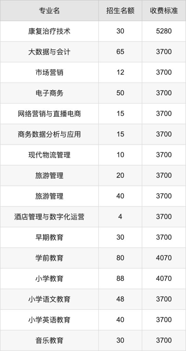 三门峡职业技术学院在文科高职高专批招生的各个专业,每年的学费是3700元-5280元。招生人数最多的专业是护理,2024年招100人,学费是5280元。