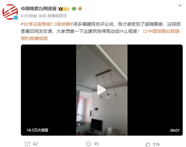 @中国地震台网速报 官微转发网友实拍视频称:“很多福建网友评论说,刚才感受到了超强震感,这视频是莆田网友反馈,大家想象一下这建筑物得晃动成什么程度!”
