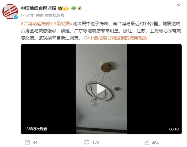 中国台湾7.3级地震 福建等多地震感强烈 网友实拍:室内吊灯疯狂摇晃