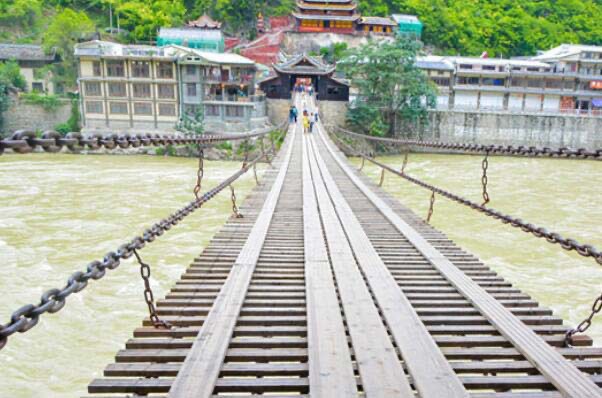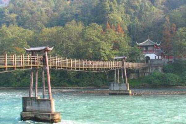 安澜桥是位于四川都江堰首鱼嘴处,横跨在内江和外江分水处的全长达500米的中国著名五大古桥之一,最早建于宋代之前,在明末时期被毁于战火,在清朝嘉庆八年才重新完成这条索桥的修建。