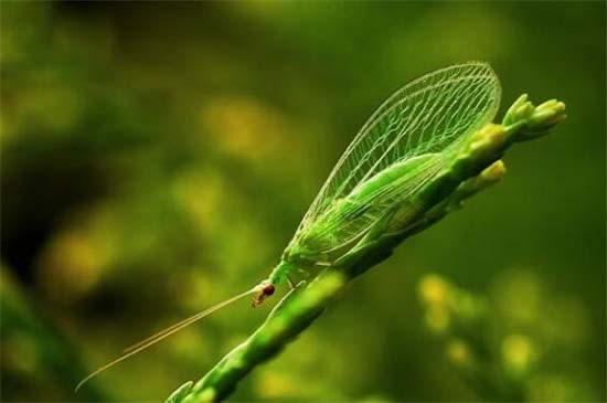 草蛉的外形十分的小清新,翠绿色的虫体,薄如蝉翼的翅膀。不过一旦被捉住,它就会释放出一股令人作呕的浓烈骚臭。草蛉的幼虫和成虫都是进食蚜虫过活的。尤其是草蛉的幼虫,钳子又大,吃蚜虫的饭量也大,绝对是蚜虫的大杀手了。