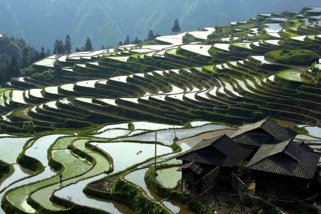 榜梯田,位于贵州省黔东南苗族侗族自治州从江县西部月亮山腹地的加榜乡东北面,距县城80公里,是中国最好梯田之一,梯田中散落着苗乡特有的吊脚楼。是苗族人世世代代留下的杰作。苗族是"稻饭鱼羹"的民族。