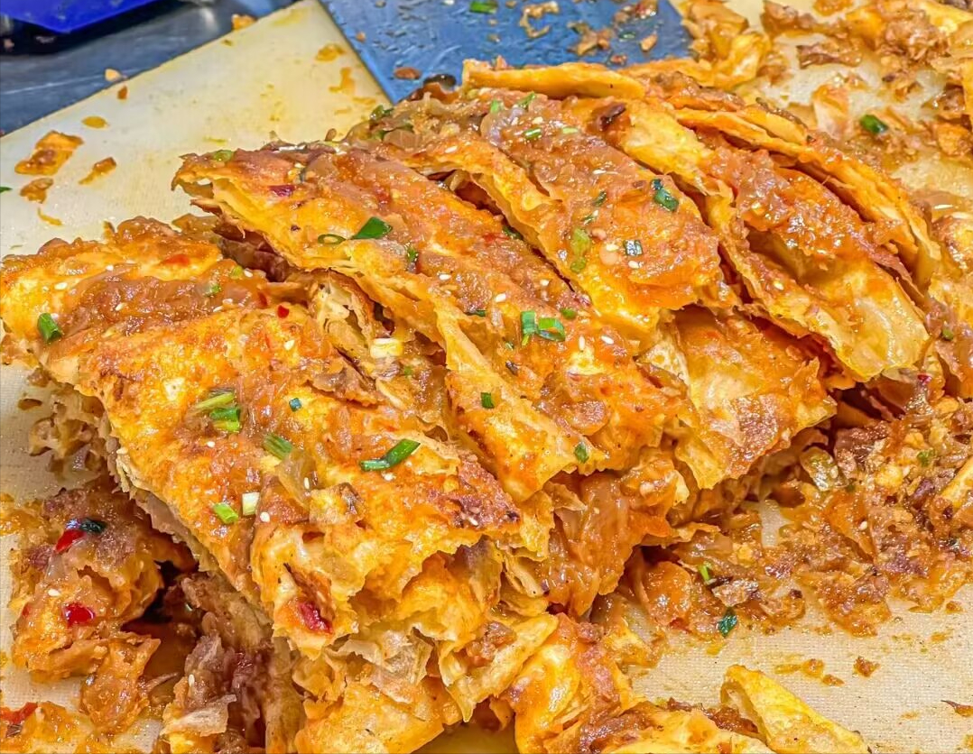 豆皮是武汉最传统的早餐之一,由糯米、绿豆、粳米三种原料制成,口感软糯。它是由糯米制成的圆形薄皮,包裹着馅料,然后煎熟。它可以卷成各种形状,如长方形和圆形。常见的口味有猪肉、牛肉和虾仁等。豆皮中有绿豆的清香味,又有糯米的粘糯口感。