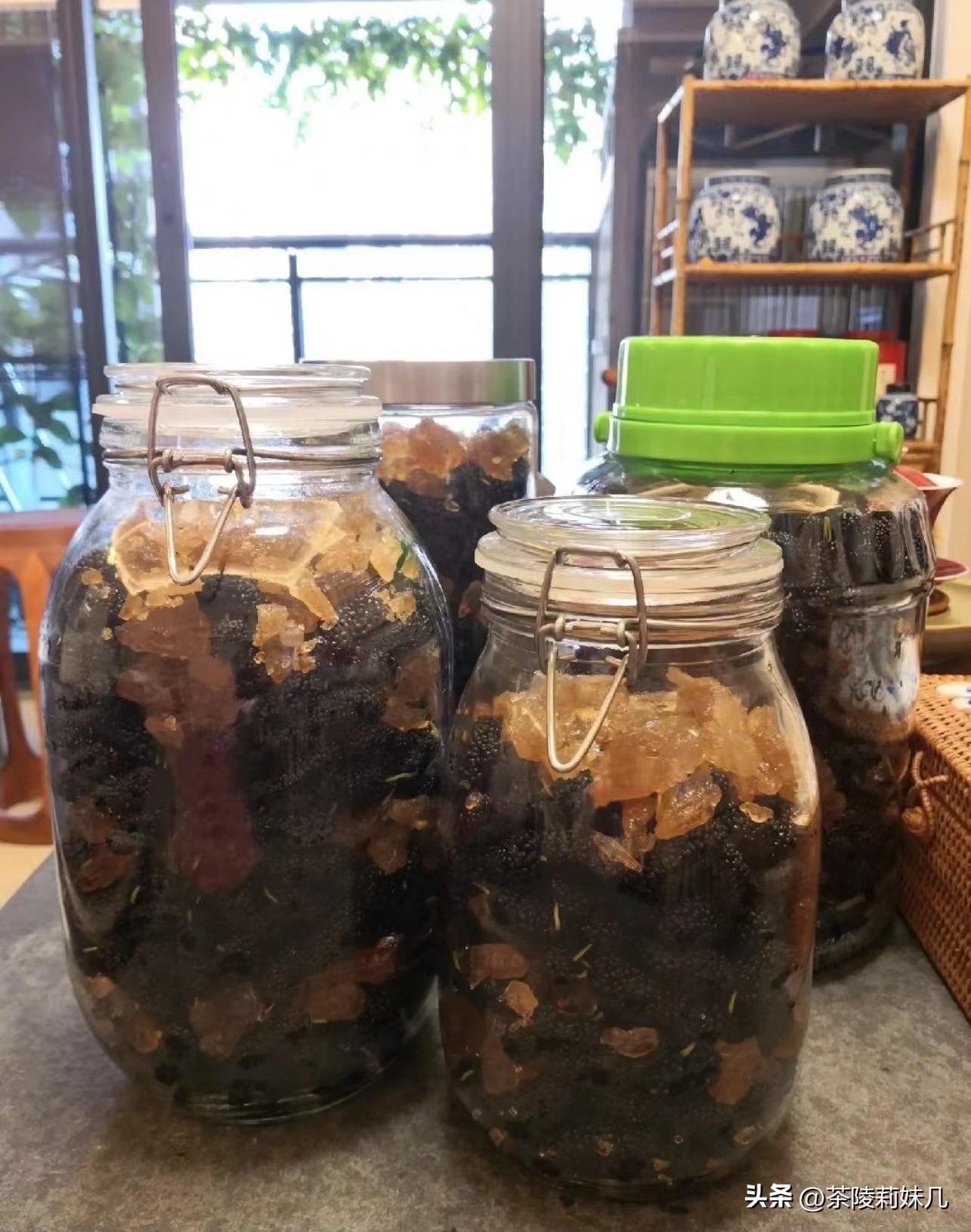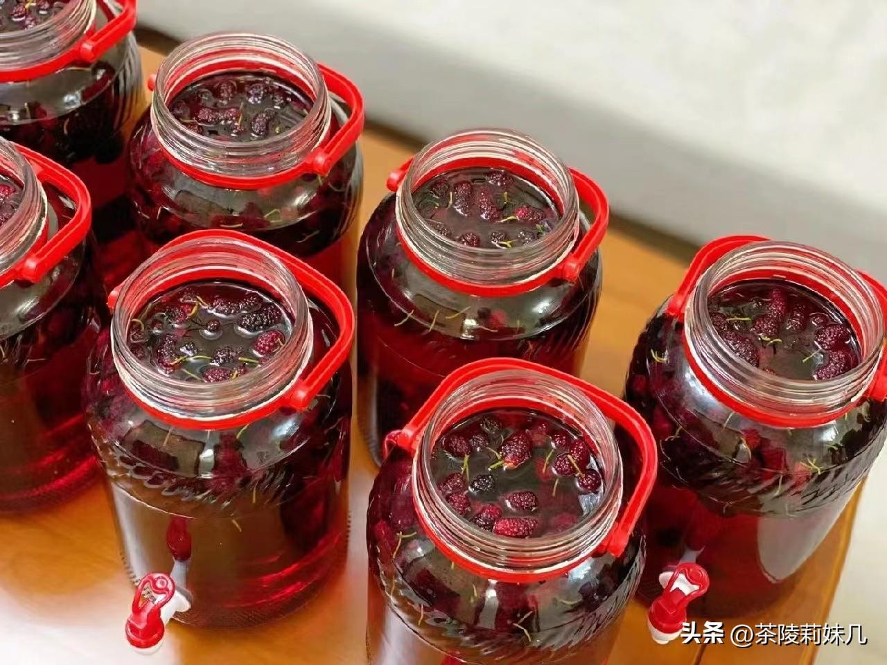 4:桑葚酒的制作,其实超级简单,但是一定要封好口。装罐密封好放在阴凉处一个月,在中途可以多多摇晃瓶子,让内部酒水充分融合,自然发酵。如果不喜欢太甜的话,可以少放冰糖。