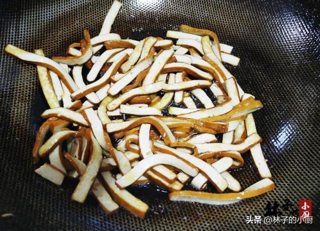 第二步:炒锅中加入适量的油,油热后倒入豆干,炒倒香干表皮有点点微焦,这样吃起来绵软干香;