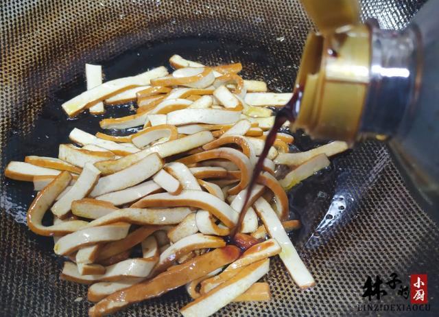 第三步:我们倒入适量的生抽炒匀,不要加多了,我们后面还要加盐,把炒匀的香干先铲起来备用,生抽的加入使得味道更为丰富;