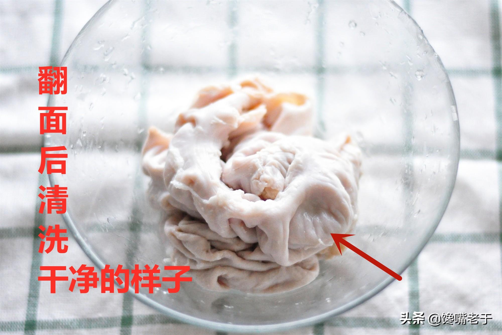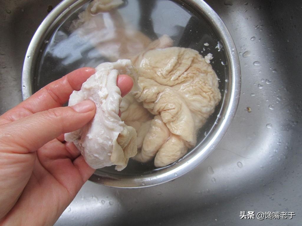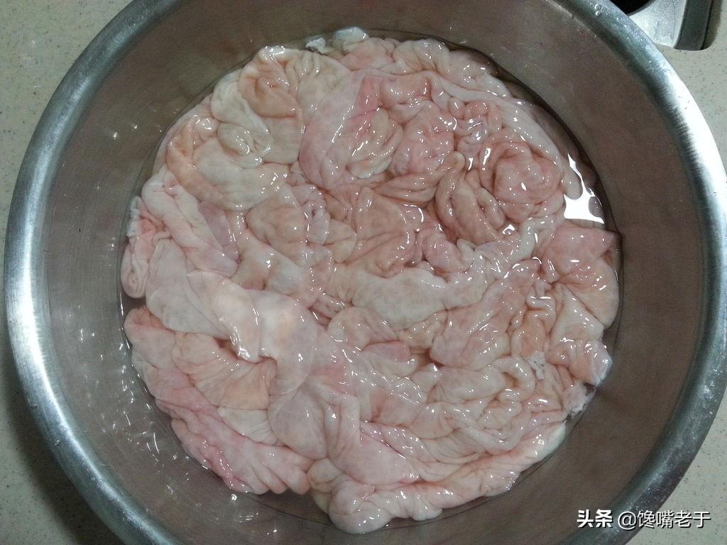 最后,再把泡好的肥肠用清水冲洗干净,这样肥肠的外层就算洗好了。