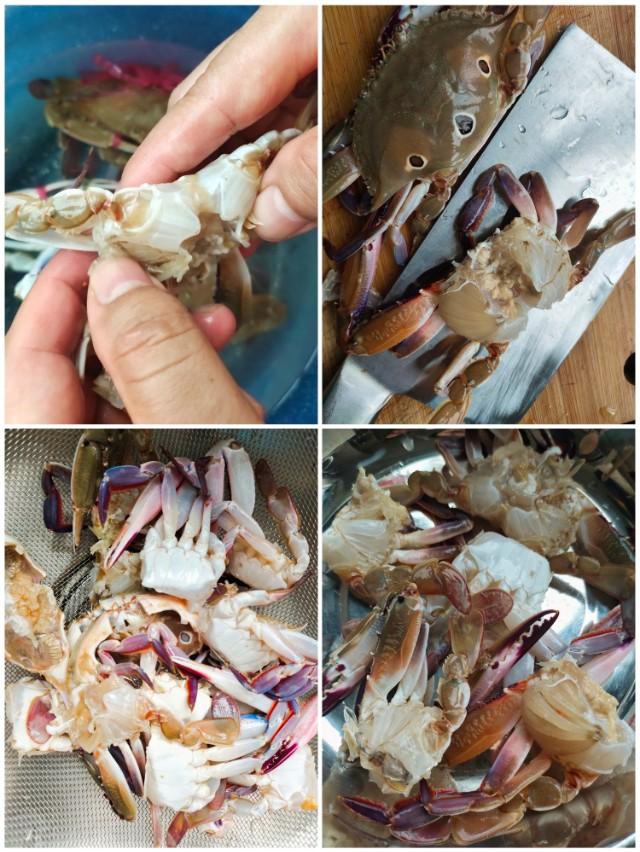 - 将花蟹刷净,切开处理干净后冲洗,沥干水,装盘备用;