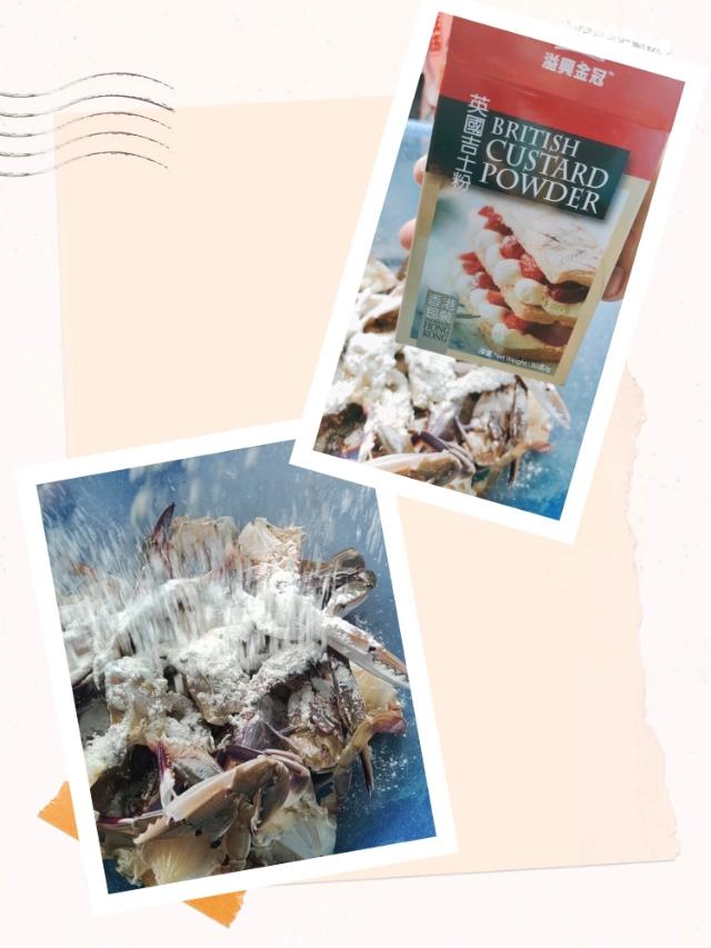 2. 把吉士粉均匀撒在沥干水后的花蟹上并搅拌均匀;