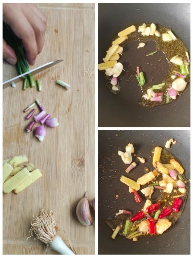 4. 锅烧热后倒入油,放入切好的姜、葱、蒜爆一下,再加入干辣椒炒出香味;