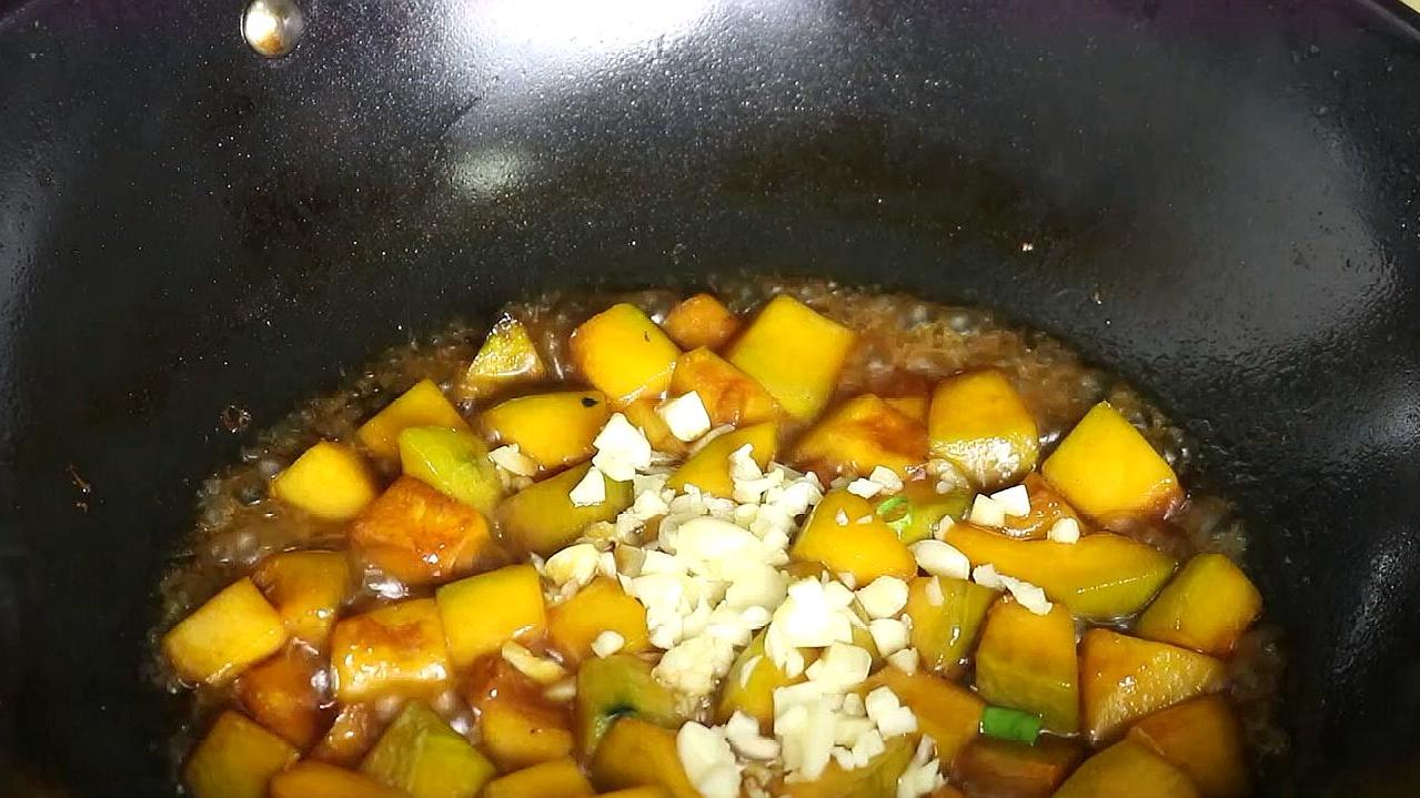 6、10分钟的时间到了之后打开锅盖,把蒜末放进去炒香,炒香之后先出锅装盘,然后再撒上准备好的葱花,一道特别美味的糖醋南瓜就这样完成了。