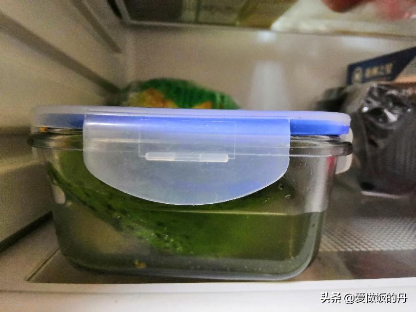 7、把黄瓜装到干净的保鲜盒中,腌出来的水分也倒进去。然后盖好盖子,放入冰箱冷藏存放。