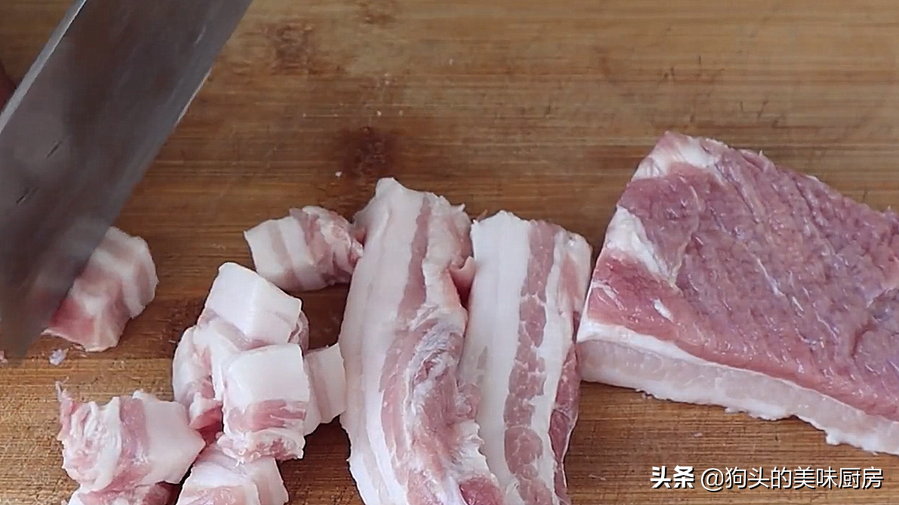 2.清洗干净之后剃掉猪皮。猪皮不要丢,可以熬煮 做成猪皮冻。然后改刀切成小长条,最后切成小块,不要太小,后面遇热它会回缩。