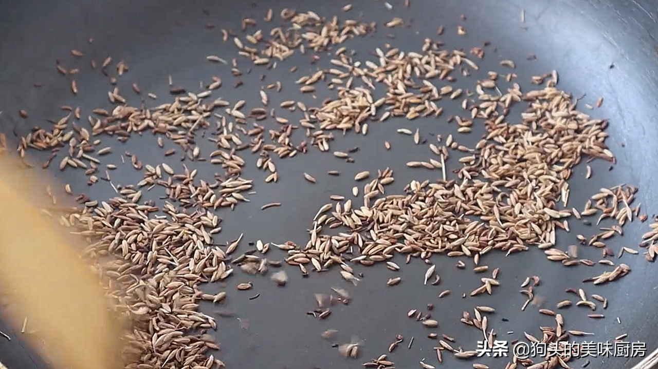 3.然后准备一小碗的整粒孜然,放入锅中,开小火把它炒出香味,炒到颜色微黄。现炒得比孜然粉要香。