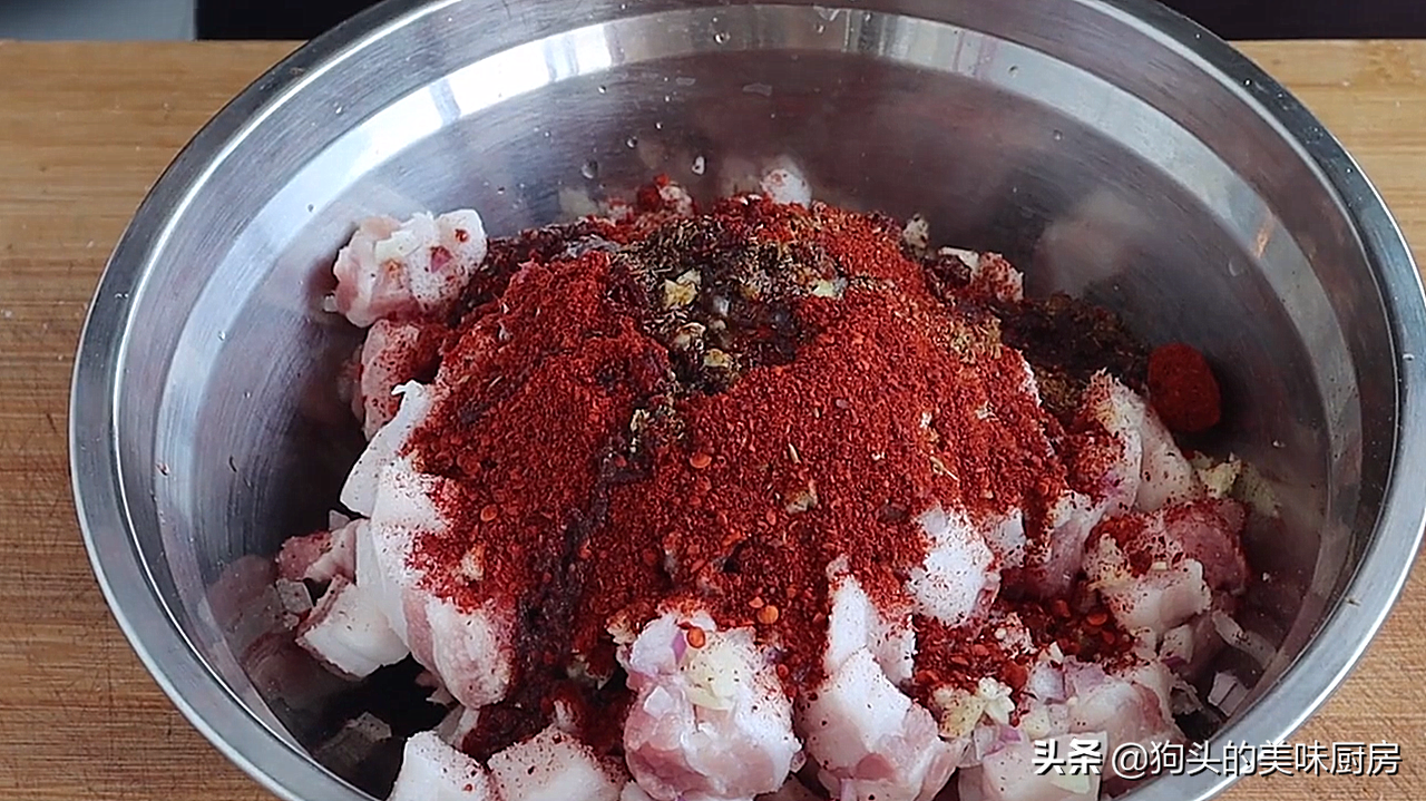 7.先把切好的猪肉块放入盆中,再把大蒜末、洋葱碎加进来。然后往里面调入适量盐,适量五香粉,少许 鸡精,少许白糖。看个人口味往里面加入辣椒粉,最后调入适量生抽少许清水防止太干。