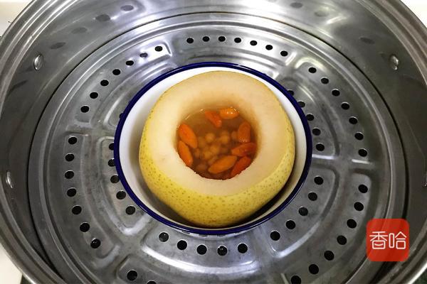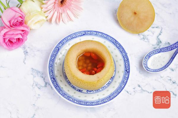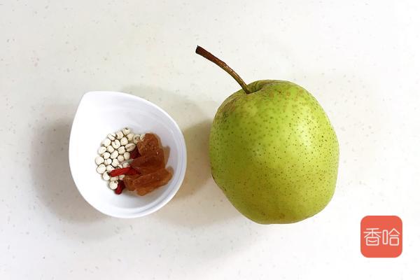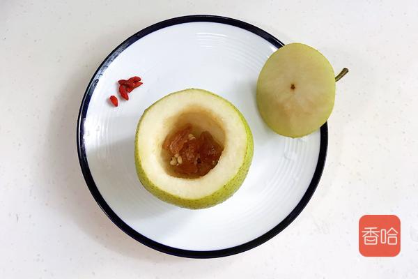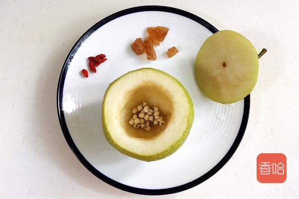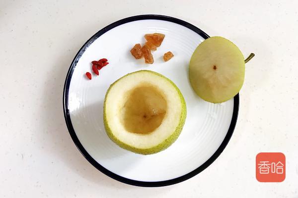 雪梨1个、冰糖10克、川贝母3克、枸杞6~8粒