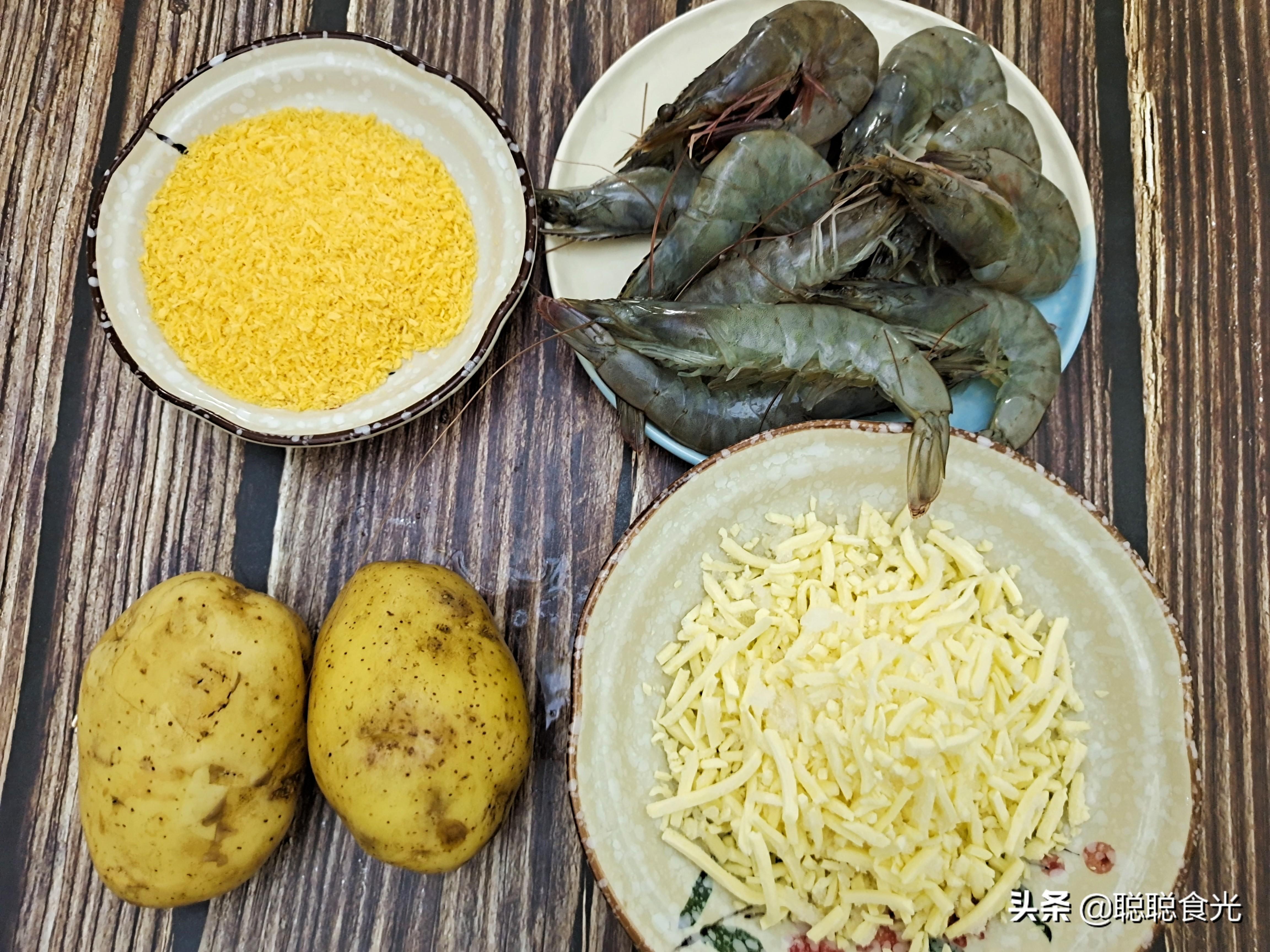 青虾300克,土豆2个,马苏里拉芝士200克,面包糠适量,盐2勺,胡椒粉1勺