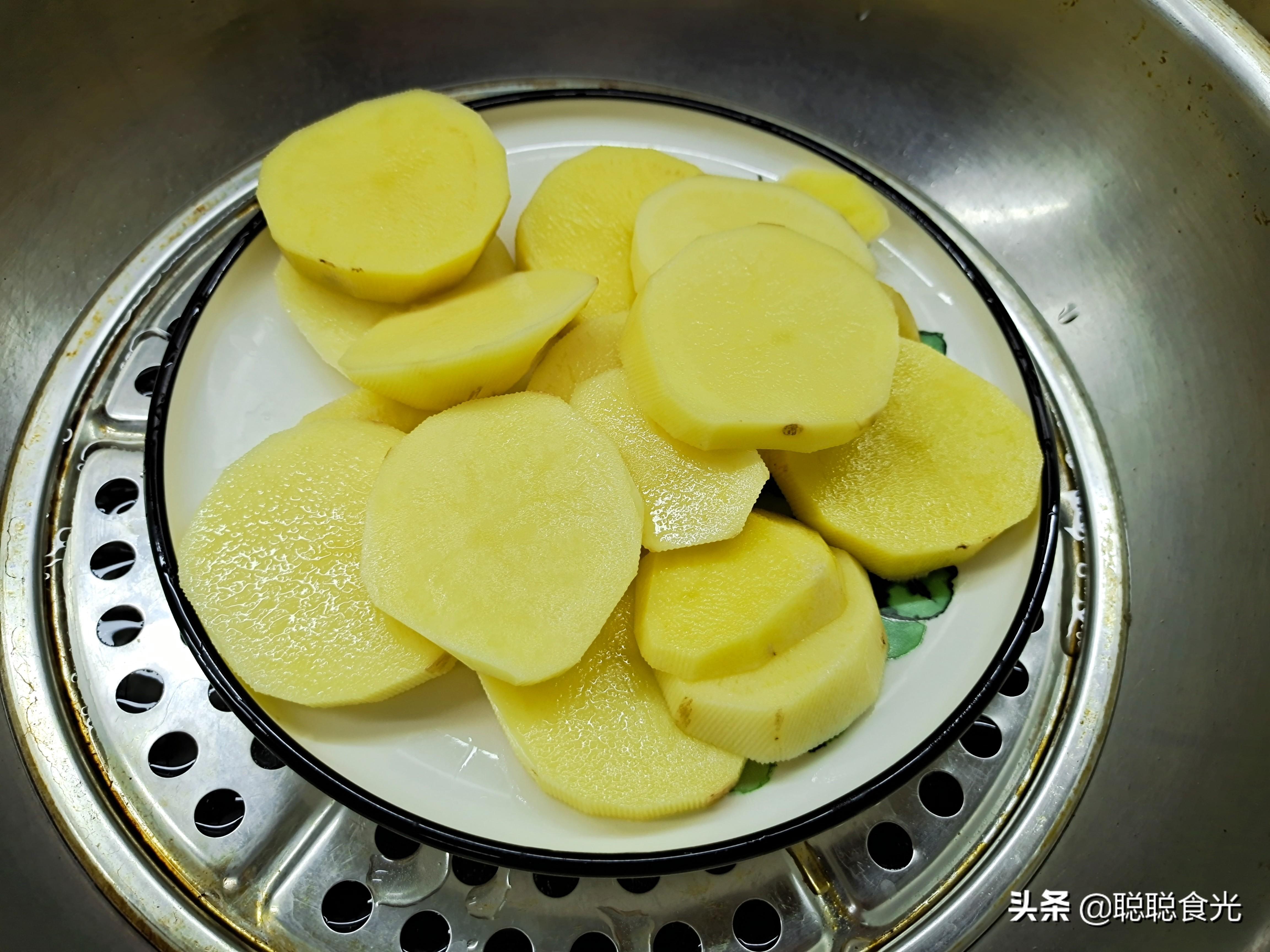 步骤一:先把土豆去皮,切成块,放入蒸锅中蒸20分钟,蒸到土豆软烂,中间不能有硬芯。