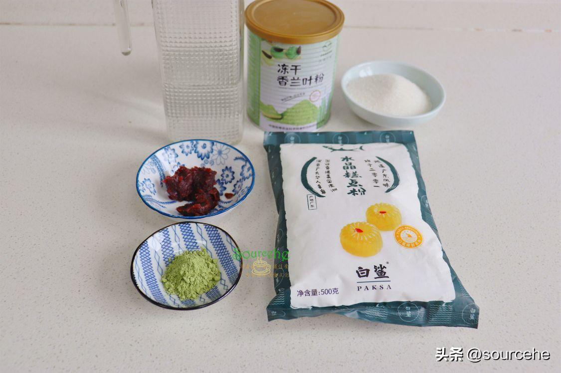 【抹茶凤梨水晶糕】食材: 水晶糕粉250克、饮用水650克、抹茶粉5克、白砂糖100克、凤梨馅80克(我做了二种口味,拍照的时候用的是红豆馅,其实是红豆、凤梨口味都做了)