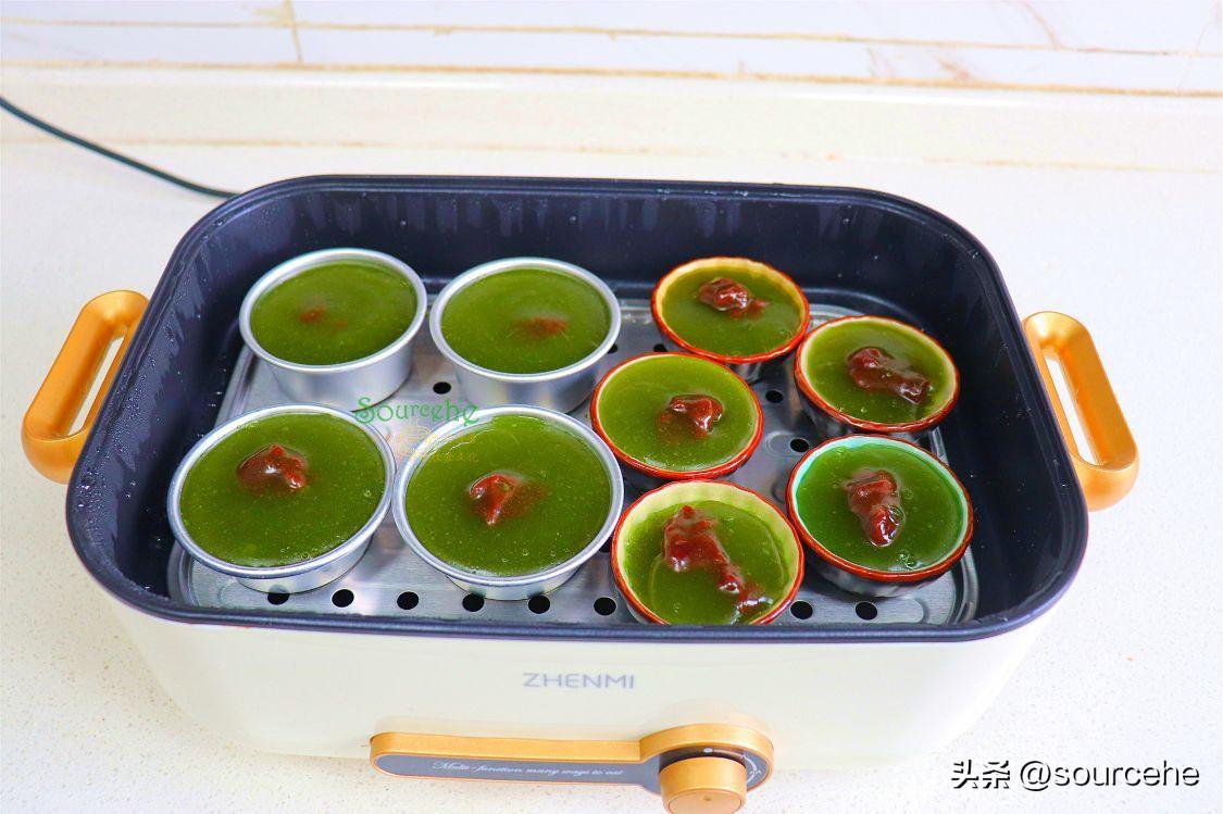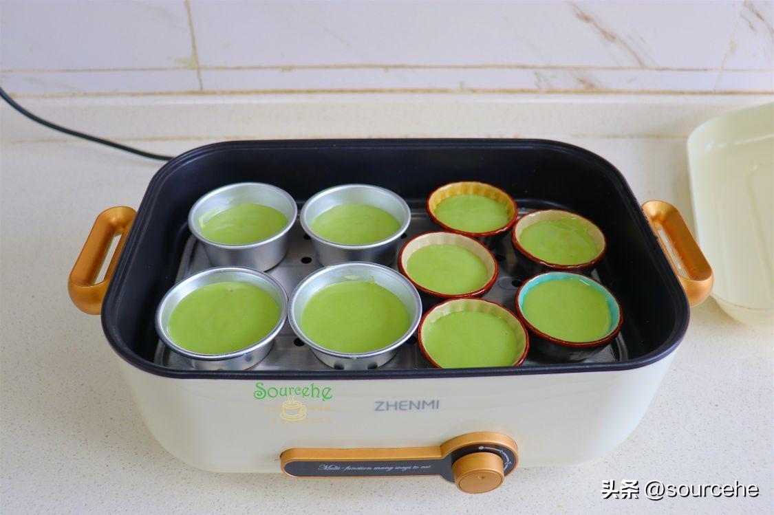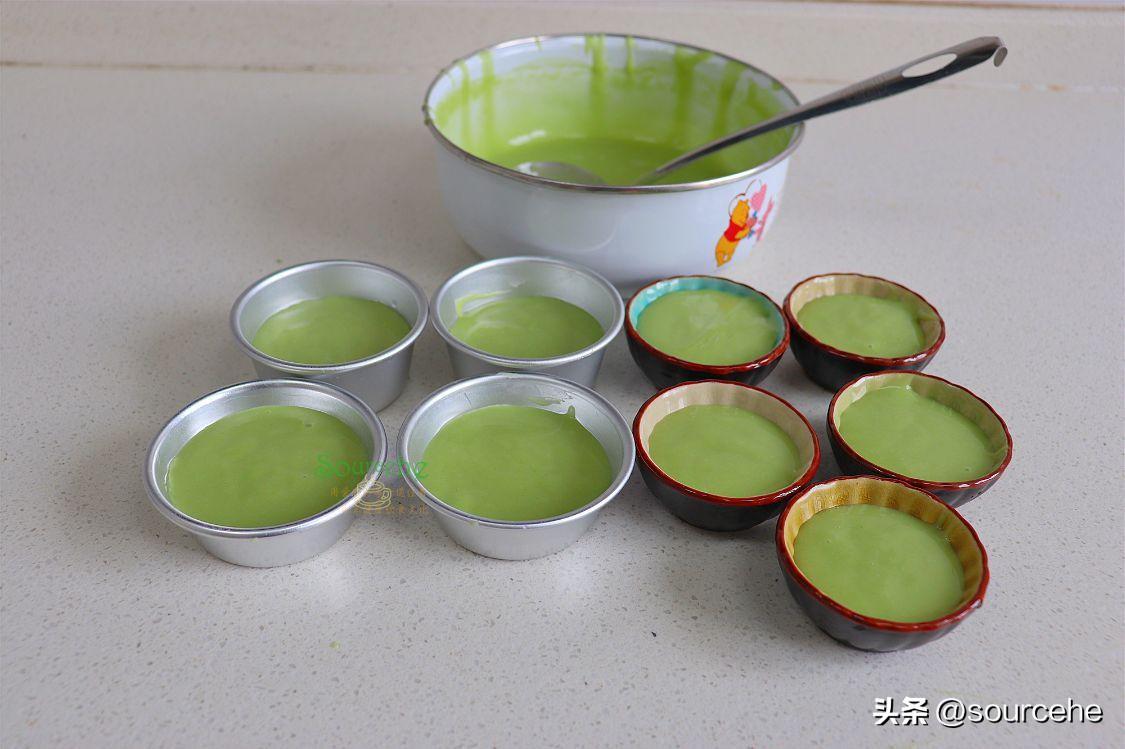 步骤2:把浆糊倒入模具里,六分满就可以,另外家里模具不够用,所以有陶瓷模具,也有烘焙的模具。这个没关系,只要可以蒸熟就行。