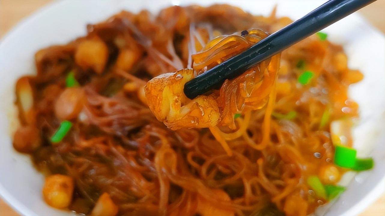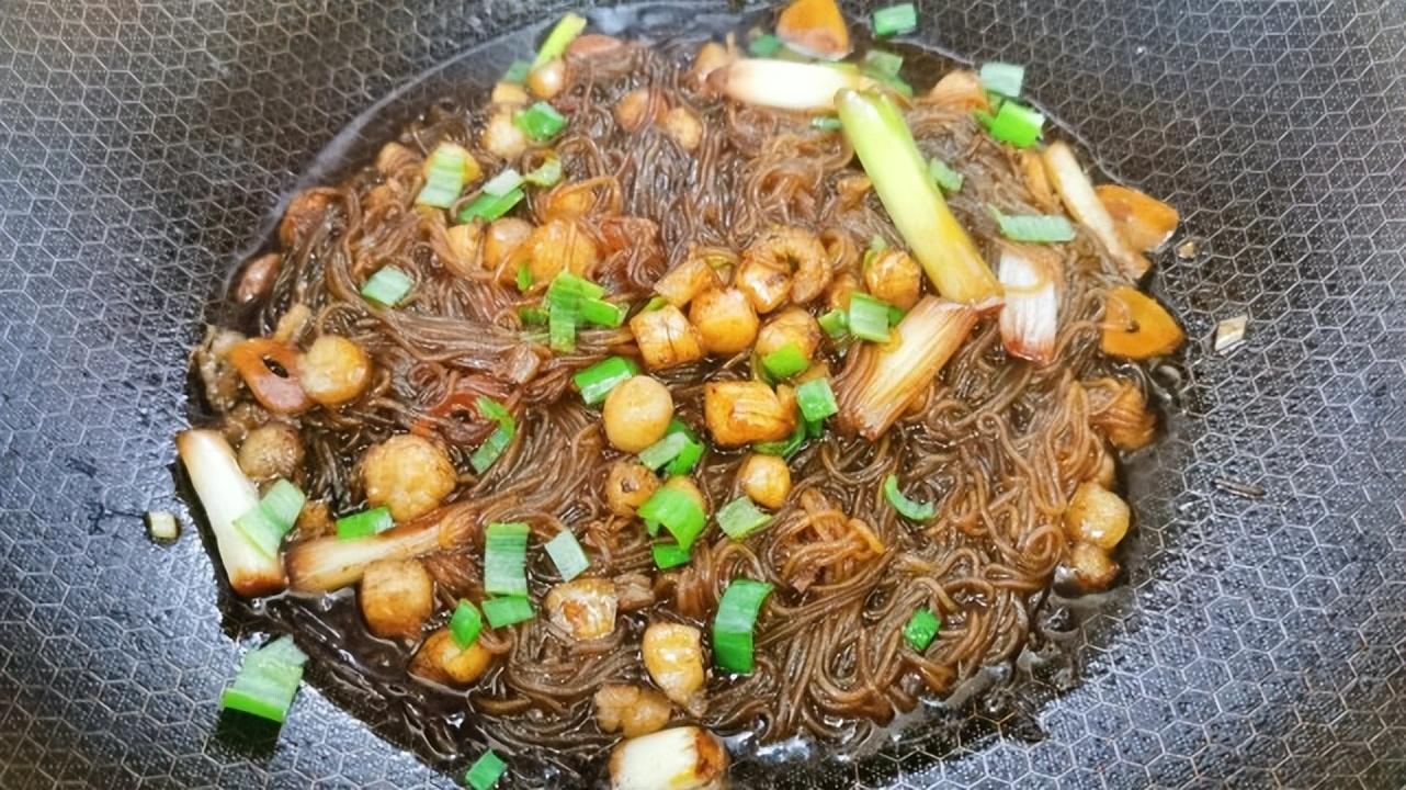 3、起锅烧油,把扇贝丁倒入锅内,炒一下,炒至两面微微发黄。再把干辣椒段、蒜瓣、姜片、小葱炒出香味,再把提前泡好的粉丝倒入,放入2勺味极鲜、少许老抽、1勺蚝油翻炒一下,放入半碗冷水没过粉丝,盖上锅盖把水煮沸腾后倒入扇贝丁,开大火煮2分钟关火即可!