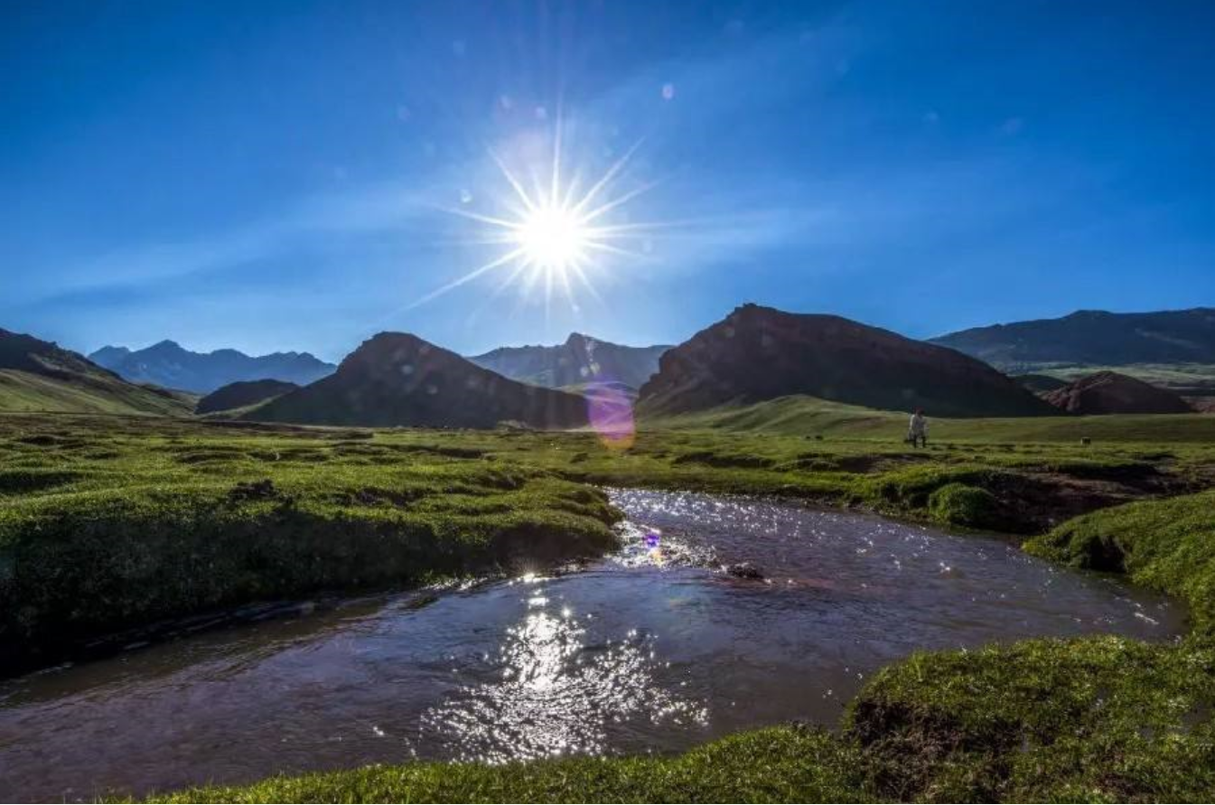 清晨,整个牧场被乳白色的云霭笼罩着,草叶上挂满了晶莹的露珠,空气清新,湿润,漫步在晨曦的草原令人心醉。当东边的太阳腾空而出,万道霞光洒射到草原上的那一刻,红的纱帘,绿的草毯,加上柯尔克孜毡房冒出的缕缕白烟,把草原装点得更加秀丽,还有那穿过草原的条条小溪,弯弯曲曲从远处的冰山、雪山、冰川,潺潺而来,一起奏起悦耳动听的琴声,水中的小鱼都随着乐曲翩翩起舞,这流水给草原带来无限的生机,给牧民带来无尽的欢快,也带着草原的欢声笑语悄悄地滑向远方。在这里,人们尽情地领略大自然的绮丽景色。